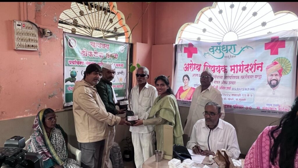डॉक्टर आशिष शर्मा आयुर्वेद तज्ञ यांनी यावेळी 300 जणांना मोफत औषध दिली, तसेच चाणक्य लोकसेवा संस्था व वसुंधरा फाउंडेशन वतीने कै.वैशाली मंगेश खंडाळे यांच्या स्मरणार्थ 350 वृक्ष वाटप व 200 विद्यार्थीना खाऊ वाटप करण्यात आले.