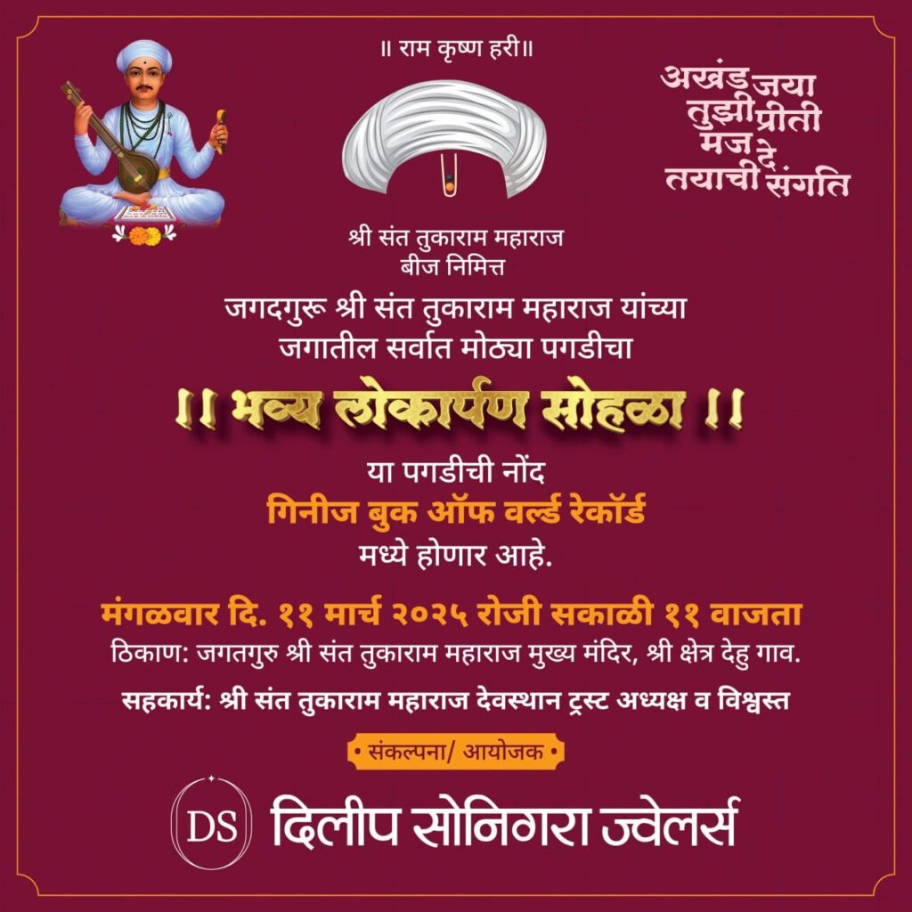 महाराष्ट्र २४ ।। विशेष प्रतिनिधी ।। सोमवार दि. १० मार्च ।। संत तुकाराम महाराज बीज निमित्ताने जगातील सर्वांत मोठ्या जगद्गुरू संत तुकाराम महाराज यांच्या पगडीचा लोकार्पण सोहळादि. ११ मार्च रोजी सकाळी ११ वाजता जगद्गुरू संत तुकाराम महाराज मुख्य मंदिर, श्रीक्षेत्र देहू या ठिकाणी पार पडणार आहे. याप्रसंगी विशेष उपस्थिती ‘वर्ल्ड रेकॉर्डस् इंडिया अॅण्ड जिनिअस फाऊंडेशन’चे सीईओ पवनकुमार सोलंकी आणि ‘संत तुकाराम महाराज देवस्थान ट्रस्ट’ श्रीक्षेत्र देहूचे अध्यक्ष हभप पुरुषोत्तम मोरे यांची राहणार आहे, तर संकल्पना व आयोजन ‘दिलीप सोनिगरा ज्वेलर्स’ यांनी केले आहे.