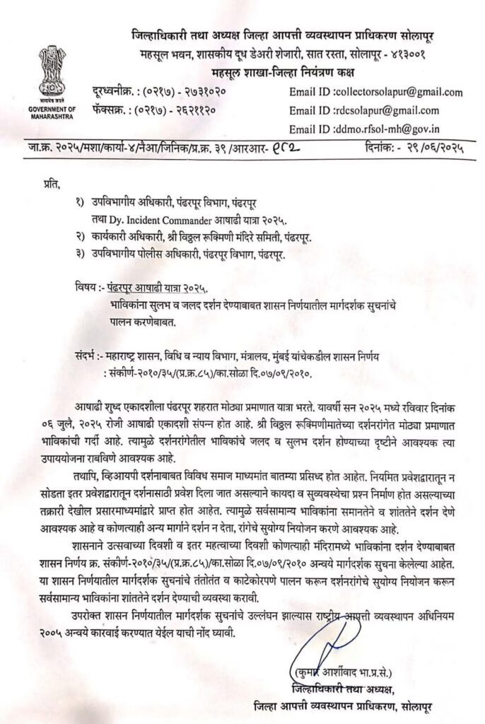 जिल्हाधिकारी कार्यालयानं जारी केलेल्या पत्रकानुसार अनेकदा नियमित प्रवेशद्वारातून काही भाविकांना न सोडता इतर प्रवेशद्वारांतून दर्शनासाठी प्रवेश दिला जातो. यामुळं कायदा आणि सुव्यवस्थेचा प्रश्नसुद्धा उभा राहतो. याच धर्तीवर सामान्य भाविकांना समानतेनं आणि शांततेनं दर्शन दिलं जाणं आवश्यक असल्याची बाब अधोरेखित करत कोणत्याही अन्य मार्गानं दर्शन देण्यात येऊ नये असा स्पष्ट सूचना देत आदेशाचं पालन न करणाऱ्यांवर कारवाई करण्यात येईल असा थेट इशारा जारी करण्यात आला आहे.